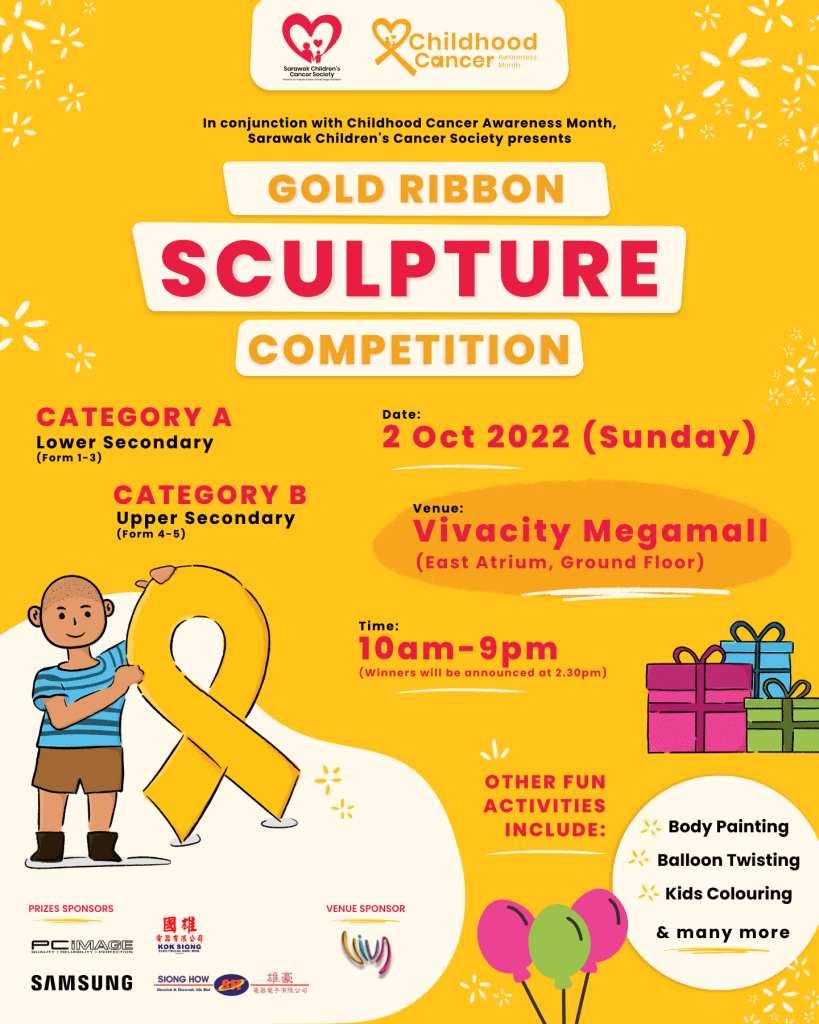 In conjunction with Childhood Cancer Awareness Month (CCAM) in September, Sarawak Children’s Cancer Society (SCCS) is organising a Gold Ribbon Sculpture Competition for Kuching secondary school students at the Vivacity Megamall on Sunday, 2 October 2022.
