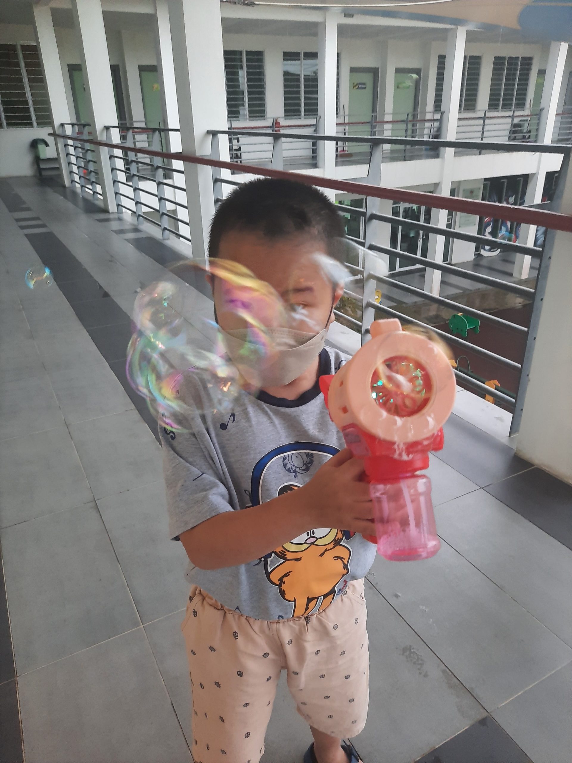 Wesley playing with a bubble gun at SCCS halfway home in Kuching.
