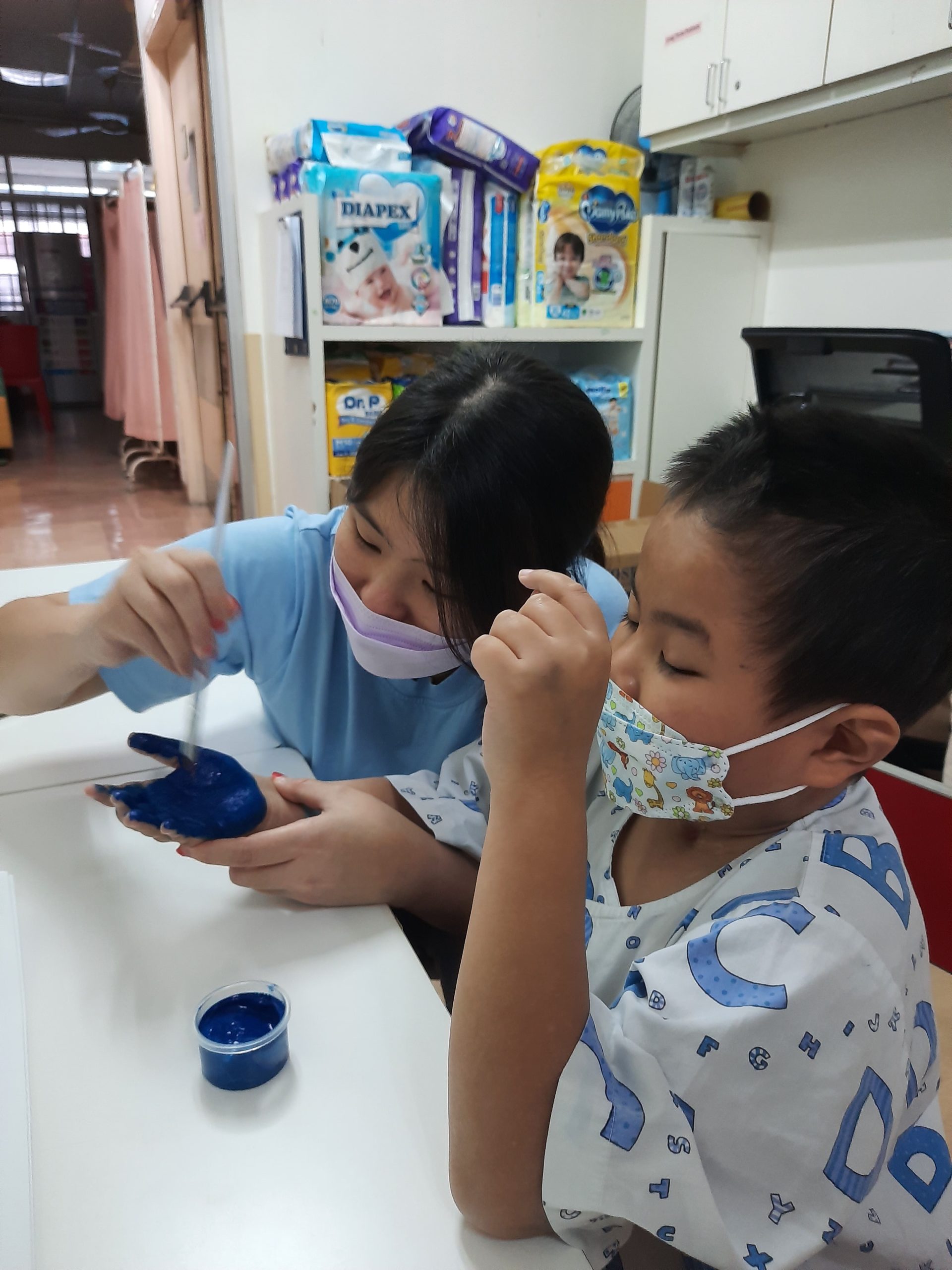 Wesley and his mother doing arts and craft activity at the ward.
