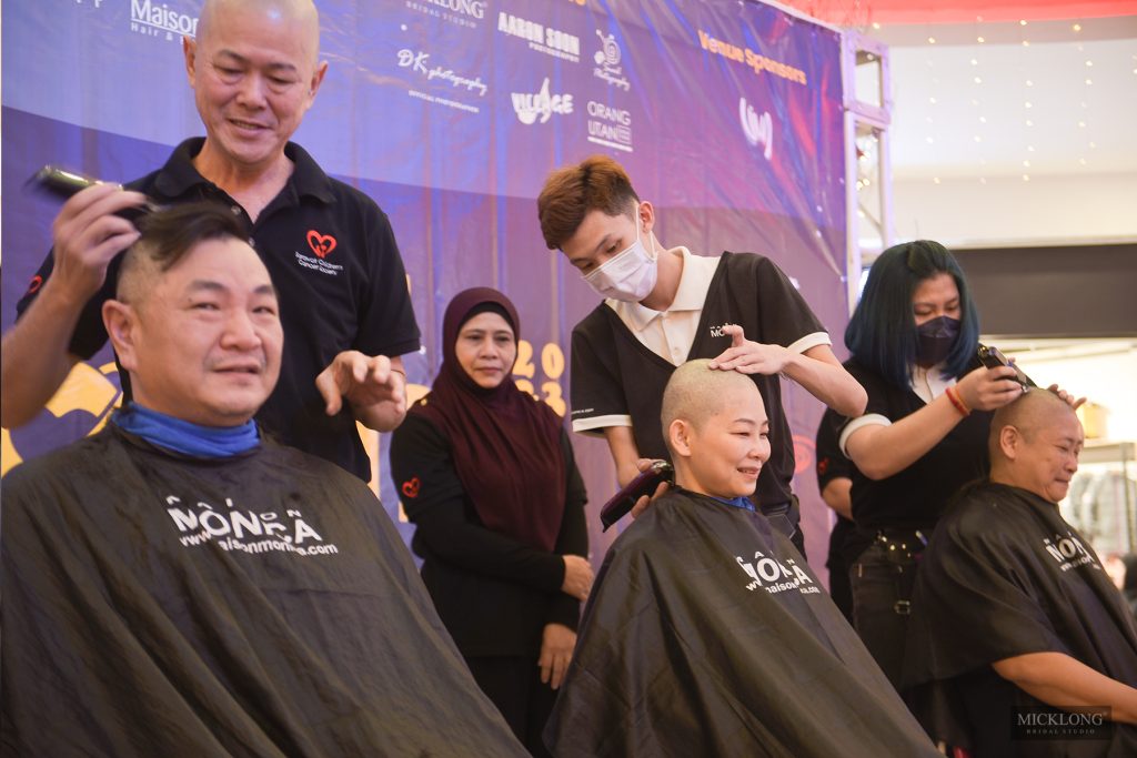 Daniel’s father, mother and aunty at the live-shaving event during GoBald 2023, shaving their hair in support of Daniel and other children with cancer.