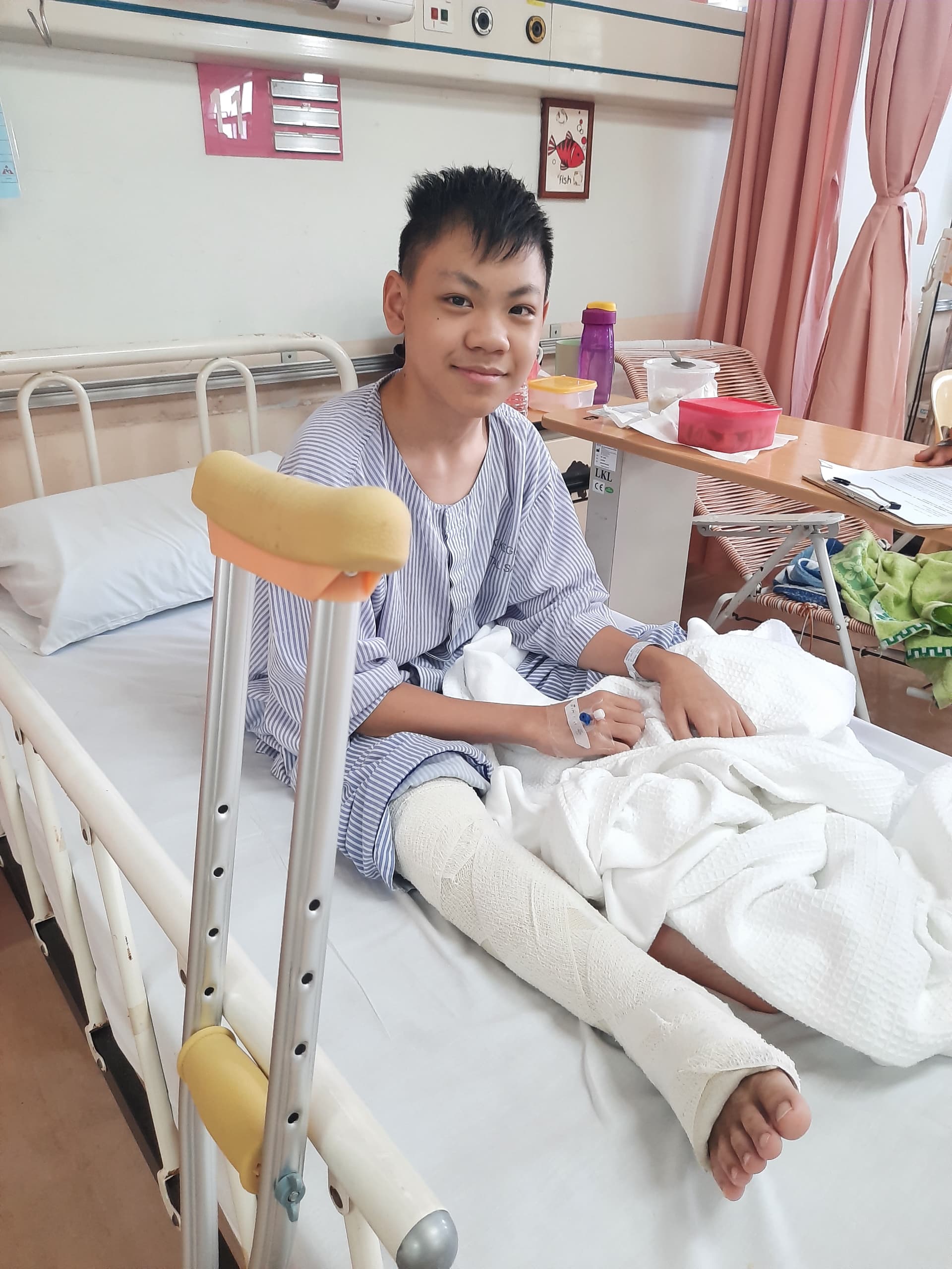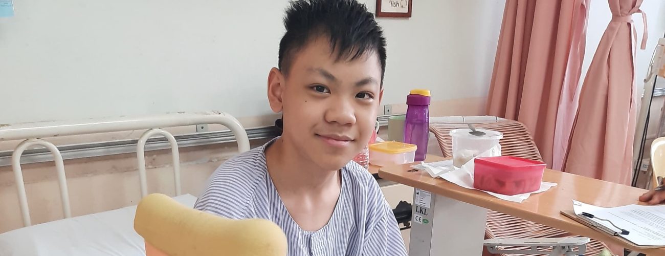 In June 2018, Ambrose bravely began his chemotherapy journey, completing active treatment by 2020. Following this, he underwent his first endoprosthesis operation (a metal implant to replace the bone) on his right leg, a critical procedure designed to remove the cancerous bone while preserving his limb. Ambrose underwent another surgery to further adjust the prosthesis and keep it in place. Fortunately, the Malaysian government fully sponsored the operation, alleviating the family’s financial burden and allowing them to focus on Ambrose’s recovery.
