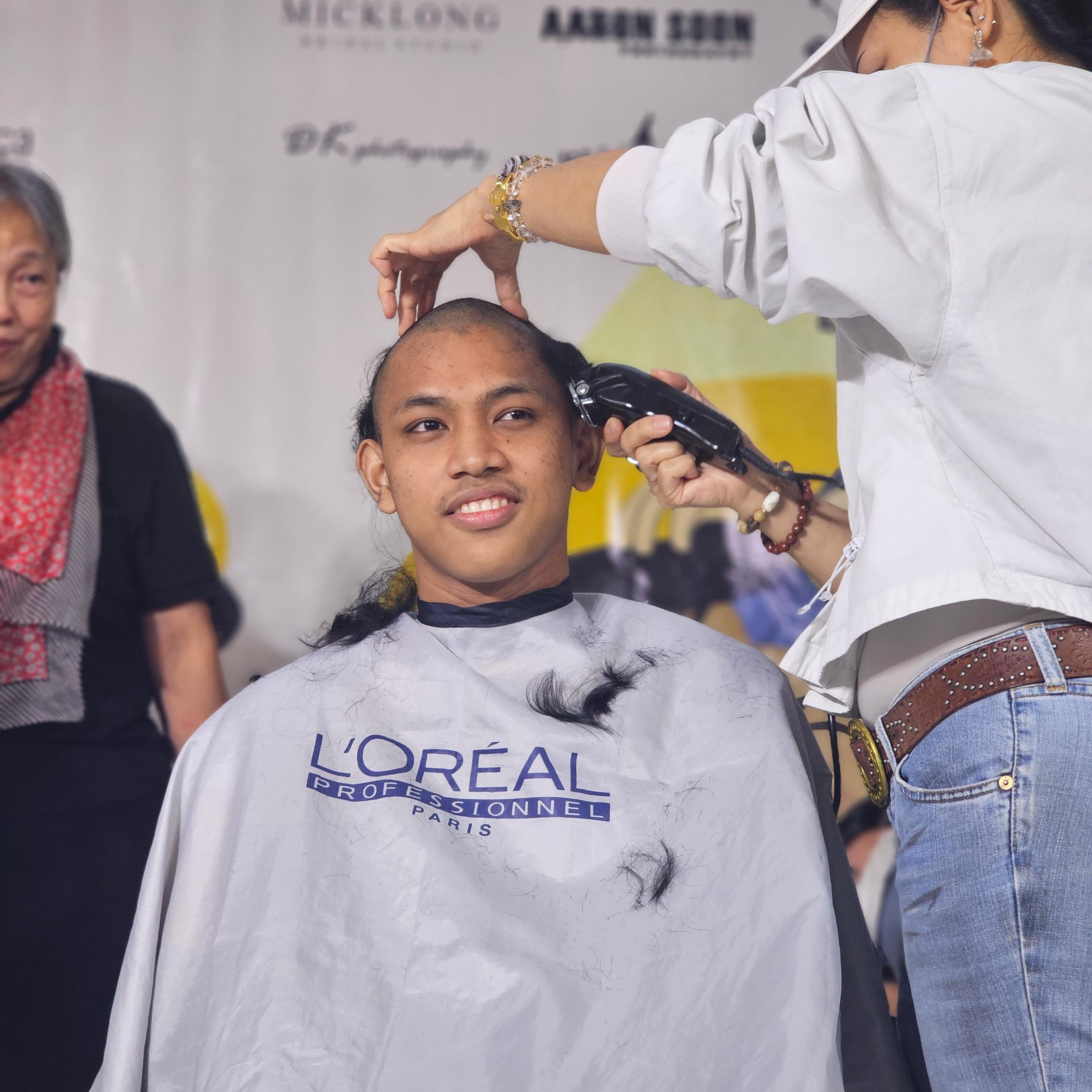 Nineteen-year-old Faez Nazirul Zamahari, diagnosed with Stage 4 proximal femoral osteosarcoma two years ago, has since completed his treatment and reunited with his family in Miri. He, along with his father, Zamahari Bin Ahmad, Nur Qamarina’s brother, Mohd Aiman, and Jeremy Ting, the son of Yang Berhormat Datuk Sebastian Ting were among the first to shave on stage today to show support for their family members or highlight SCCS’ services for other families affected by childhood cancer.